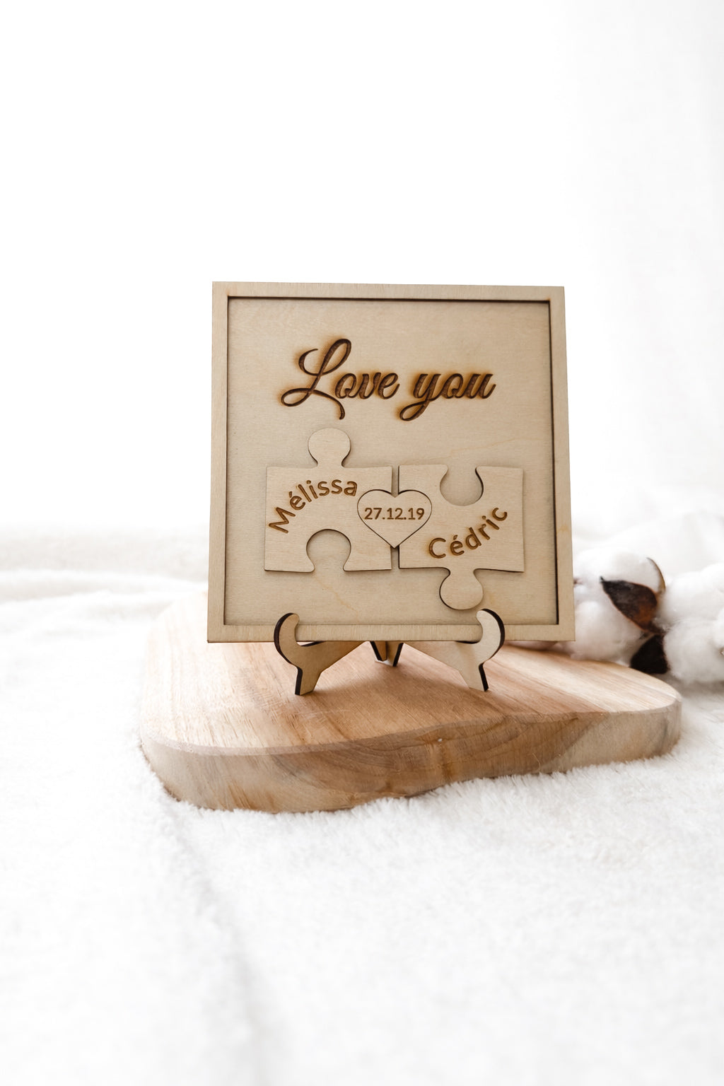Une création en bois délicate et symbolique, pensée pour représenter deux personnes qui s’assemblent parfaitement. Ce cadre met en scène deux pièces de puzzle personnalisées avec les prénoms, réunies autour d’un cœur gravé d’une date importante.