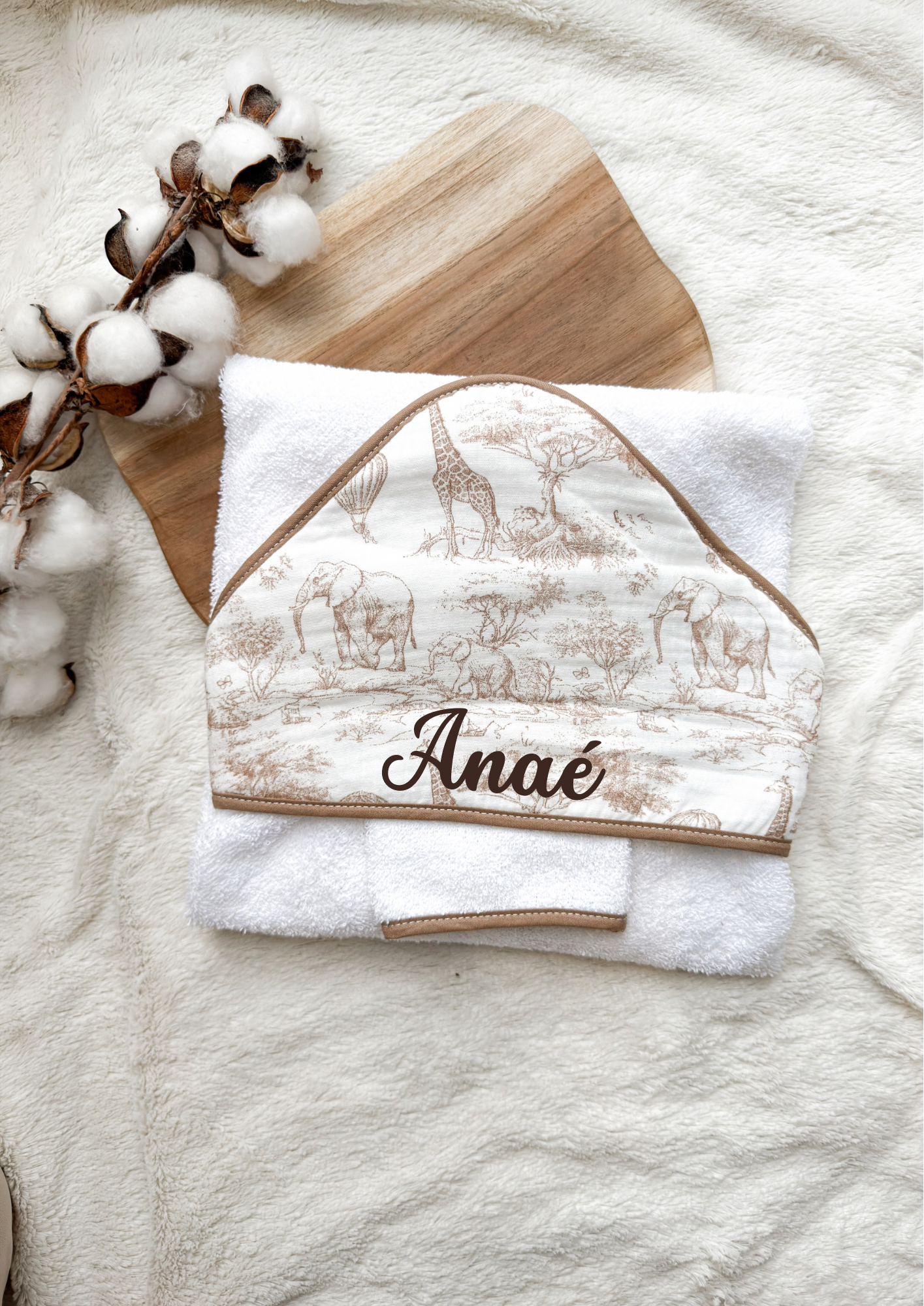 Rendez la sortie du bain encore plus douce avec cette cape de bain motif savane, parfaite pour envelopper bébé dans un cocon de chaleur.