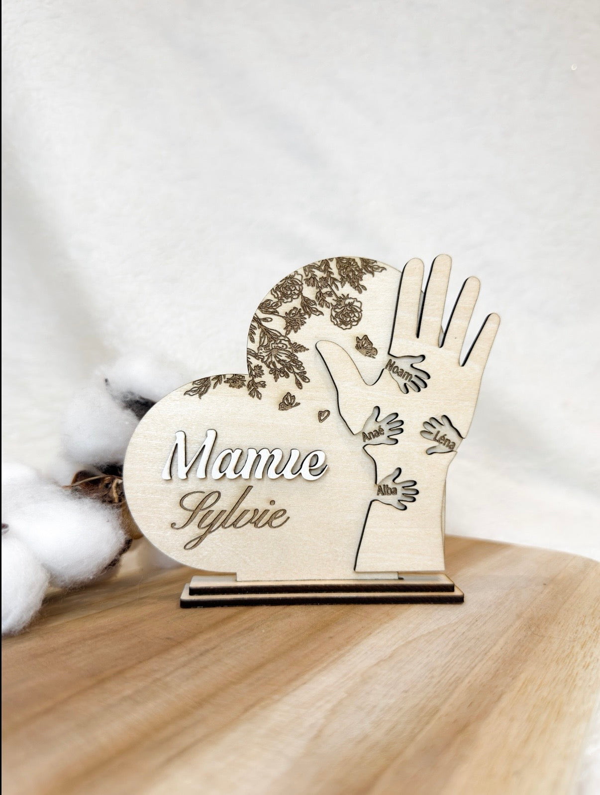 Le prénom de la mamie est inscrit sur le cœur, accompagné de motifs floraux finement gravés, pour une création douce, élégante et pleine d’émotion.