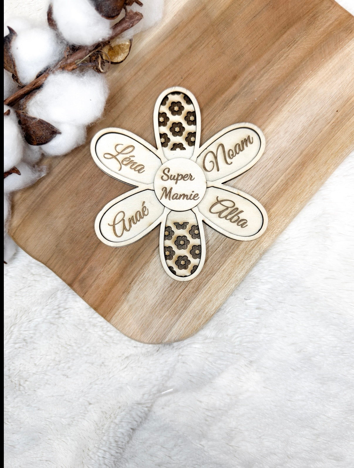 Cette jolie fleur décorative met à l’honneur les prénoms de ses petits-enfants, délicatement gravés sur chaque pétale, avec un message central rempli d’affection. Un objet symbolique qui représente les liens forts et uniques de la famille.