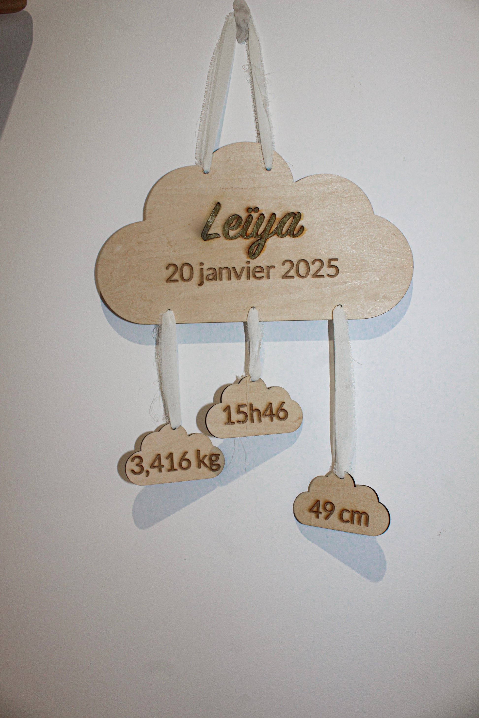Cette décoration de naissance en bois, disponible en forme de fleur ou de nuage, est personnalisée avec les informations de naissance de l’enfant. La pièce centrale est gravée avec le prénom et la date de naissance, et accompagnée d’éléments suspendus indiquant le poids, la taille et l’heure de naissance. Les rubans apportent une touche délicate, idéale pour décorer une chambre de bébé ou offrir un cadeau de naissance unique et personnalisé.